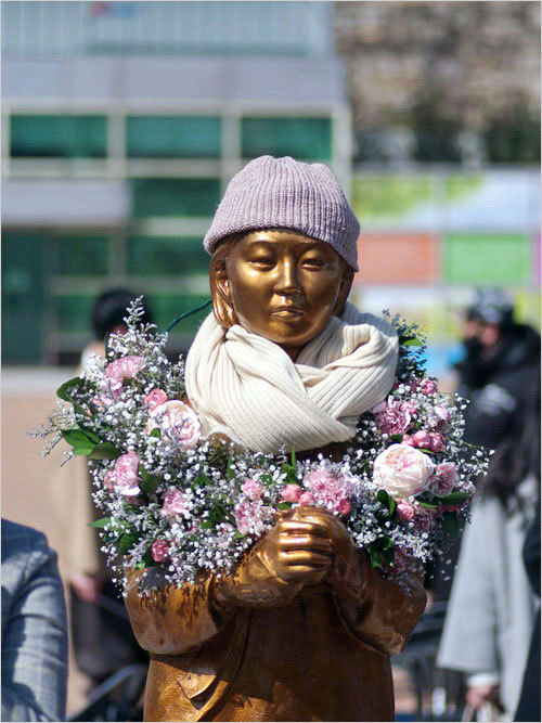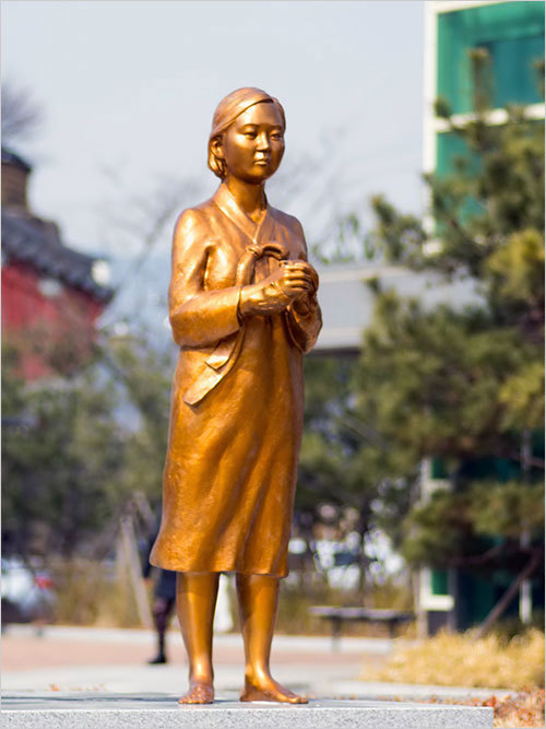 평화의 소녀상은 '위안부'로 끌려가기 전의 앳된 소녀다. 그 소녀들은 일본군에게 전선으로 끌려가 만신창이가 되어 죽거나 돌아왔다. 어린 소녀들은 이제 평균연령 90세가 넘는 할머니가 되었고, 치욕적인 상처를 공개하면서 일본에 사과와 배상을 요구하고 있다. 올 들어 두 분이 세상을 떠나 정부에 등록된 위안부 피해자 239명 가운데 생존자는 이제 30분뿐이다.