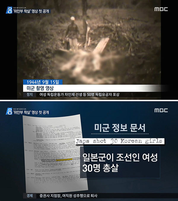 그 모습 위로 2월 28일 서울시에서 공개한 영상 속, 학살된 '위안부'의 모습은 차마 떠올릴 수 없다. 태평양전쟁 패전 직전인 1944년, 중국 윈난성에 진주한 미·중 연합군이 찍은 영상 속에서 학살되어 무더기로 쌓아 둔 조선인 위안부들의 주검은 참혹했다.