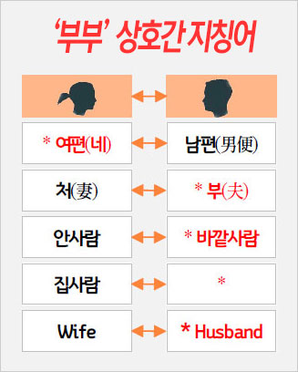 결국, 남편과 아내를 가리키는 중립적인 지칭어는 없는 셈인데 부부를 가리키는 한자어가 여럿(부부, 내외, 부처 등)인 것에 비기면 이는 부부 사이의 관습적 불평등을 드러내고 있는 것일 수도 있겠다.