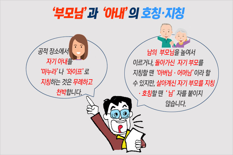 과거엔 부모도 ‘아비, 어미’로 낮추었지만, 지금은 그 정도까지는 아니다. 그런데 표준화법에서는 살아 계신 자기 부모를 호칭하거나 지칭할 때는 ‘-님’ 자를 붙이지 않는다. 단 편지글에서는 예외다. ‘아버님 전 상서’가 가능한 이유다.