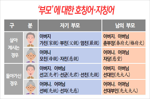 요즘은 한자어로 된 지칭어를 잘 쓰지 않는다. 그러다 보니 한자에 익숙하지 못한 젊은 세대들이 살아계신 부모와 돌아가신 부모를 가리키는 한자어를 혼동하는 때도 곧잘 생기는 듯하다. 그래도 살아계시는 걸 기준으로 한 가친(家親)과 선친(先親), 남의 부모님을 가리키는 춘부장(春府丈)과 자당(慈堂)쯤은 구분할 수 있는 게 좋겠다.