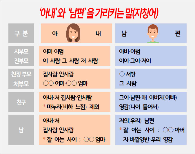 텔레비전 예능 프로그램에서 출연자들이 이 말을 태연스레 쓰고 있는 걸 보면 좀 민망하다. 마누라와 마찬가지로 윗사람 앞에서 쓰는 말로는 매우 부적절하기 때문이다. 어른 앞에서 ‘마누라’라고 하거나 ‘와이프’라고 하는 건 무례하기로 치면 도긴개긴이 아닌가 말이다.