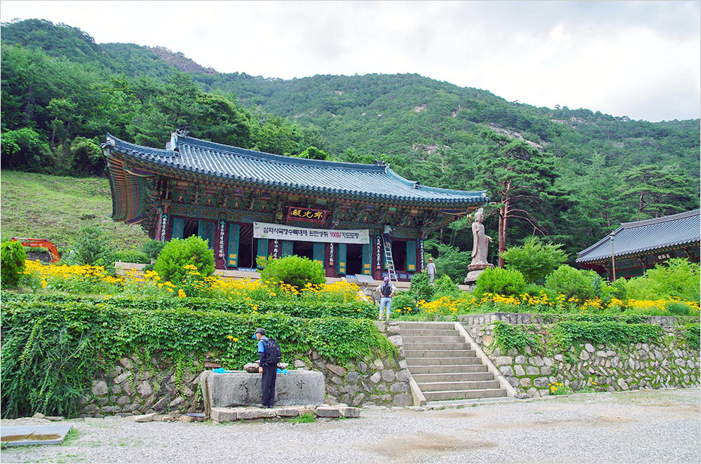 절집 뒤편에 빽빽하게 우거진 솔숲이 선사하는 안정감에도 불구하고 청기와를 얹은 적광전(寂光殿), 그 오른편에 육환장(六環杖)을 짚고 서 있는 청동 지장보살상, 적광전 앞에 흐드러지게 핀 루드베키아(rudbeckia)의 강렬한 노란 빛이 어우러지면서 절집은 어쩐지 들떠 있는 것처럼 느껴졌다.