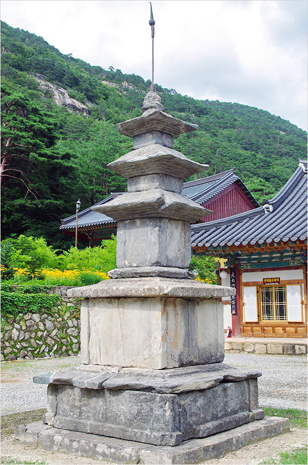 적광전 앞마당에 서 있는 삼층석탑은 9세기 후반에 조성된 것으로 짐작되는 석회암 탑이다. 높이 4.9m. 높다란 축대 위에 성큼 올라앉은 법당 탓일까. 탑은 초라하고 옹색해 뵌다. 2중 기단 위에 3층의 몸돌을 올렸는데 2, 3층 몸돌이 1층보다 1/3로 줄어버렸기 때문이다.