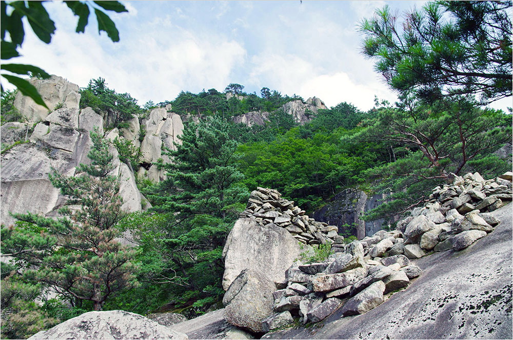 그런데, 지난 7월 중순, 나는 무엄하게도 ‘샌들’을 신고 두타산(1353m)을 올랐다. 정확히 말하면 내가 오른 것은 두타산의 초입에 있는 산성까지다. 애당초 여정에 산행 따위는 있지도 않았다. 우리는 두타산 어귀의 무릉계곡을 거쳐 정동진에서 하루를 묵을 예정이었다.