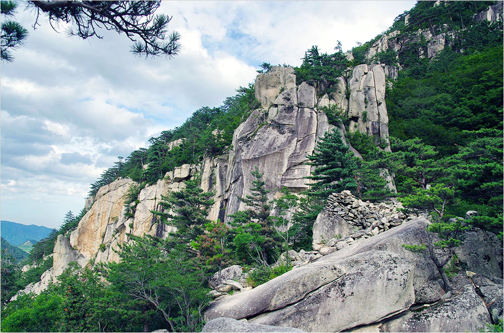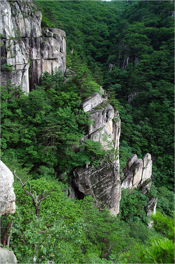 그러나 산성터에서 바라보는 두타산 조망은 훌륭했다. 멀리 가까이 암벽이 어우러진 산등성이와 울울창창한 숲이 시원했다. 두타산성은 신라 때 처음 쌓았고 1414년(조선 태종 14년)에 높이 1.5m, 둘레 2.5km의 산성을 다시 쌓았다고 한다.