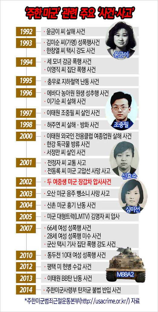 불평등한 한미 소파가 다시 뜨거운 조명을 받게 된 것은 2002년에 발생한 미군 장갑차에 의한 여중생 (효순이 미선이) 압사 사건이 발생하고 나서였다. 이 사건으로 여론이 들끓자, 우리 정부는 소파 체결 이후 최초로 미군 측에 1차적 재판권 포기를 요청했다. [관련 글 : 두 소녀의 ‘희생’으로 드러난 ‘불평등 한미관계’]