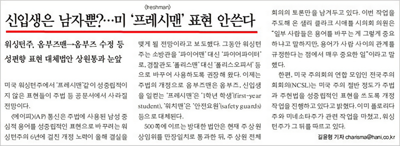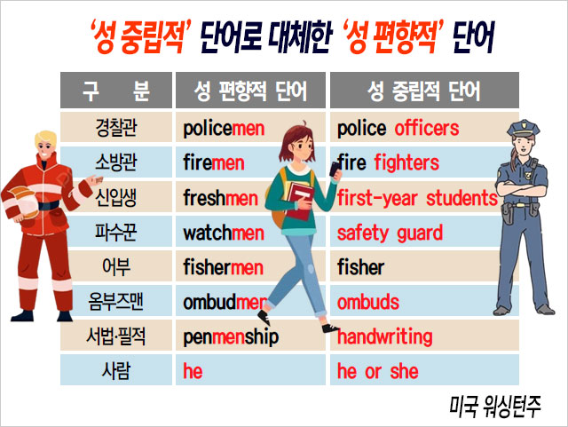 보도에 따르면 미국 워싱턴주에서는 경찰관을 ‘policemen’에서 ‘police officers’로, 신입생을 ‘freshmen’에서 ‘first-year students’로 대체했다. 소방관은 ‘firemen’에서 ‘fire fighters’로 바꿔 표기한다. 이유는 기존 단어의 ‘men’이 남성을 뜻하므로 양성평등에 어긋난다고 판단했기 때문이다.