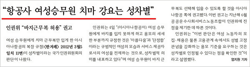 민주노총 공공운수사회서비스노동조합이 국가인권위원회에 아시아나항공의 용모 규정에 대해 진정을 제기한 것은 지난해 6월이었다. 진정의 요지는 이 회사가 여승무원들에게 치마 길이, 귀걸이 크기, 눈화장 색깔 등 구체적인 용모 규정을 적용해 오면서 바지를 허용하지 않고 있다는 것이다.