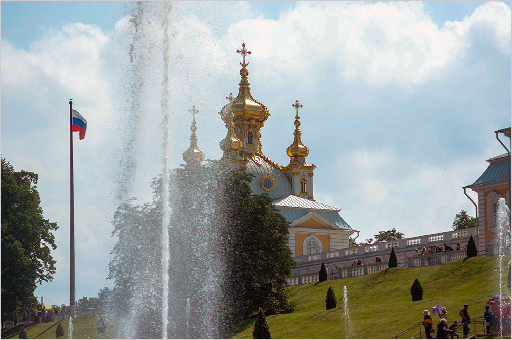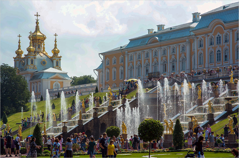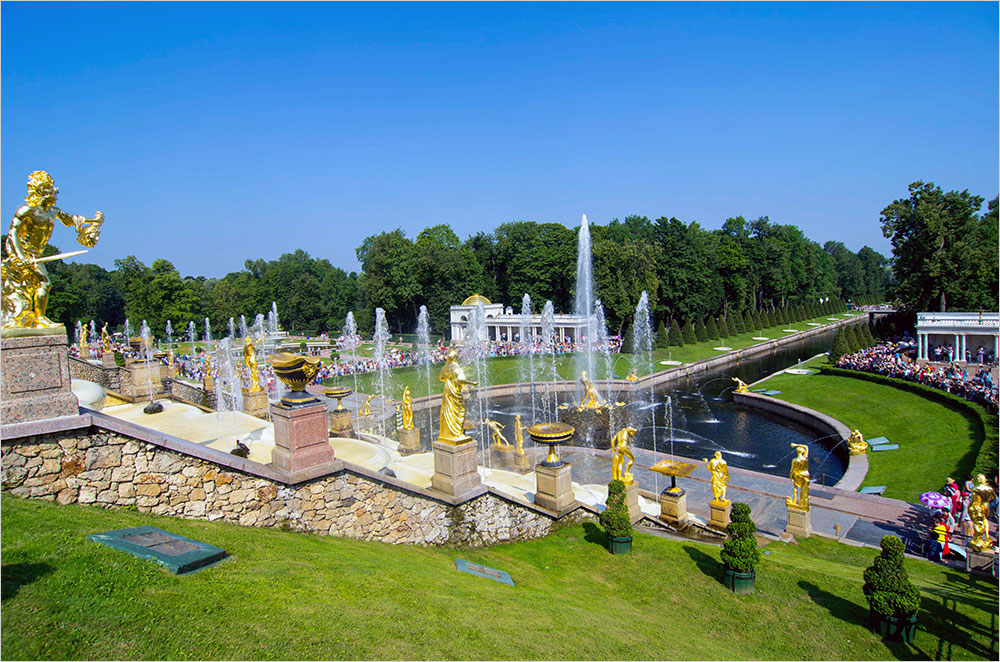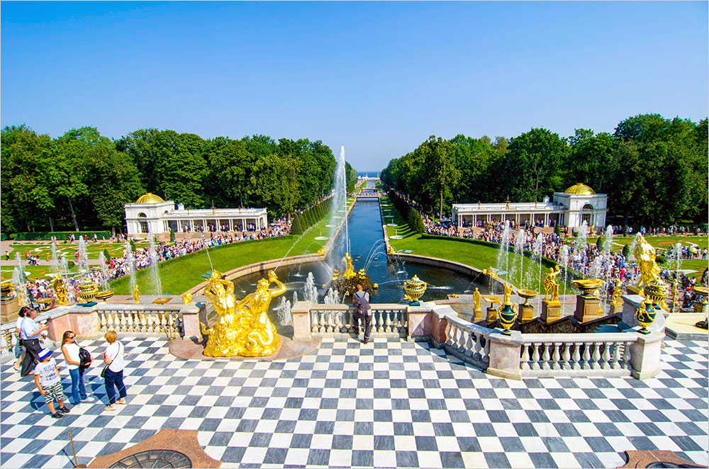 페테르고프는 독일어로 ‘페테르의 궁전’이라는 뜻이다. 페테르는 도시의 수호성인인 사도 베드로의 독일식 발음인데, 러시아에서는 ‘표트르’라 불린다. 이 궁전은 표트르 대제의 명령으로 1714년 당대 최고의 건축가와 조각가를 동원하여 9년 동안 지은 황제의 여름 별궁이다. 분수와 폭포, 그리고 정원으로 유명해진 궁전은 ‘러시아의 베르사유궁’이라고 불리기도 한다.