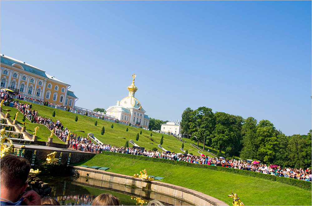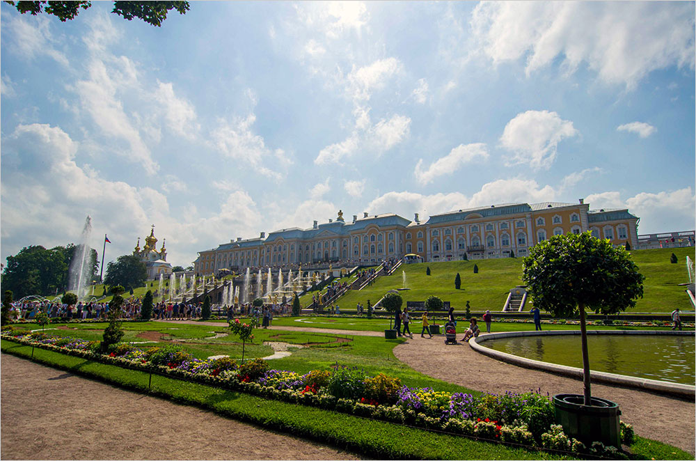 여름 궁전의 분수대는 세계에서 가장 큰데, 이 분수 시스템은 18세기에 설계되었으며 분수를 작동시키기 위해 펌프를 따로 사용할 필요가 없다. 분수는 5월부터 10월 중순 사이엔 오전 11시부터 오후 5시까지 물을 뿜는데, 이 시기에 엄청난 관광객들이 몰리는 이유다.