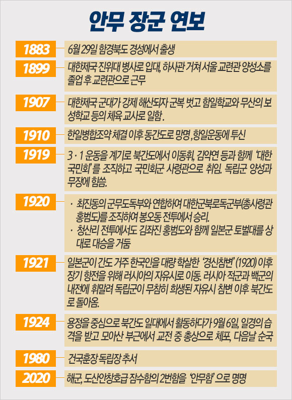 안무가 봉오동 전투와 청산리 전투의 숨은 영웅이었다. 그가 두드러지지 못한 것은 그 전투에서 홍범도와 김좌진에 가린 이인자였기 때문이었다. 승리의 주역은 이들 지휘관뿐 아니라 전투에서 스러져 간 숱한 무명의 전사들임은 더 말할 나위가 없다.