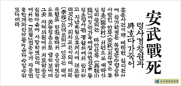 1924년 9월 7일, 대한국민회군 사령관 안무(安武,1883~1924) 장군이 용정(龍井) 자혜 병원에서 숨을 거두었다. 일본 경찰과 교전하다가 중상을 입고 병원에 이송된 그는 일제의 치료를 거부하고 죽었다. 향년 41세.