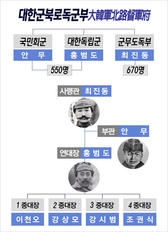 이 무렵 연합독립군의 병력은 최진동의 군무도독부계가 약 670명, 홍범도와 안무의 국민회계가 약 550명으로 총 1천 2백여 명이었다. 사령관은 최진동(1882~1945), 안무는 부관을 맡았고, 연대장 홍범도 아래 네 개 중대가 있었다.