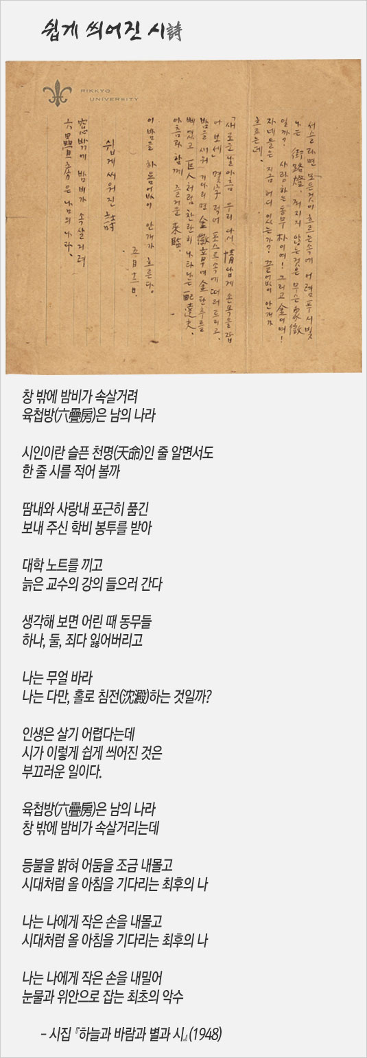 ‘쉽게 씌어진 시’는 윤동주가 일본에 유학 중이던 1942년에 쓴 작품이다. ‘육첩방(다다미 여섯 장을 깐 일본식 방)은 남의 나라’는 그가 처한 상황의 단적 표현이다. 육첩방이란 생활공간은 그를 옭매고 있는 구속과 부자유의 은유다.