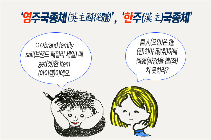 <보기>에 든 ‘국한문 혼용’ 문장은 ‘한문’이 한글’로 변화해가는 과도기적 과정의 모습이다. 그러나 위에 든 문장은 오히려 역의 과정을 밟고 있는 것처럼 보인다. 과장이라고? 멀쩡한 ‘한글’이 자발없이 ‘영자’와 몸을 섞고 있는데 그다음 과정은 불 보듯 뻔하지 않은가.