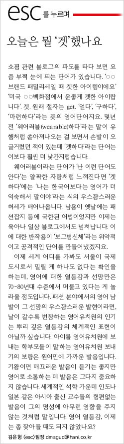 오늘 아침 <한겨레> 김은형 기자의 글[오늘은 뭘 ‘겟’했나요]에 인용된 문장이다. 시류를 잘 알고 있는 독자들은 벌써 여기 쓰인 ‘겟’이 영자 ‘get’이라는 걸 눈치채고도 남겠다. 우리말로 옮기면 볼 것 없이 ‘얻다’이다. 우리말로 써도 두 음절에 불과하니 특별히 영자로 쓰는 게 경제적이지도 않다. 그런데도 굳이 그렇게 쓰는 것은 무슨 멋인가.
