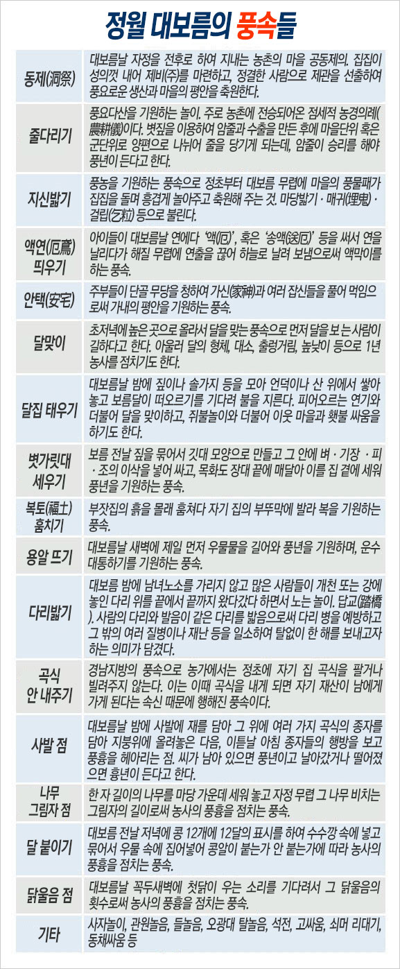 달맞이나 달집태우기는 가장 널리 알려진 풍속이다. 우리 어릴 적에는 마을의 가장 높은 봉우리에 올라서 달맞이를 하고 거기서 달집을 태우곤 했지만, 산불의 위험과 세태의 변화가 달집태우기를 산이 아닌 마을에서 하는 거로 바꿔냈다.