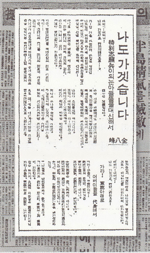 - 「나도 가겠습니다―특별 지원병이 되는 아들을 대신해서」, <매일신보>(1943.11.6.)