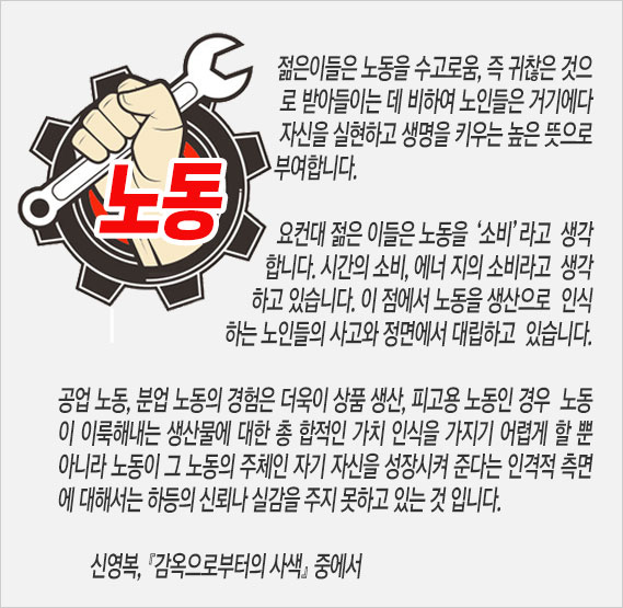 농촌을 지키고 있는 고령의 노인들이 일상적인 농업노동을 버리지 못하는 이유는 단순한 습관이나 파한(破閑)이 아니라, 그것이 그들의 삶을 구성하는 일부인 탓이다. 농업노동은 노동의 주체인 자신을 성장케 한다는 측면에서, 그리고 생명을 가꾸고 기르는 작업이라는 의미에서 가장 으뜸의 노동이기도 하다.