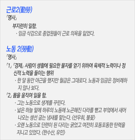 이 땅에서 자본과 노동으로 이루어지는 고용과 피고용의 실질적 내용을 이르는 말은 이중적이다. “힘써 부지런히 일하다”는 의미의 ‘근로’와 “몸을 움직여 일을 함, 사람이 생활에 필요한 물자를 얻기 위하여 체력이나 정신을 씀, 또는 그런 행위”를 뜻하는 ‘노동’이 그것이다.