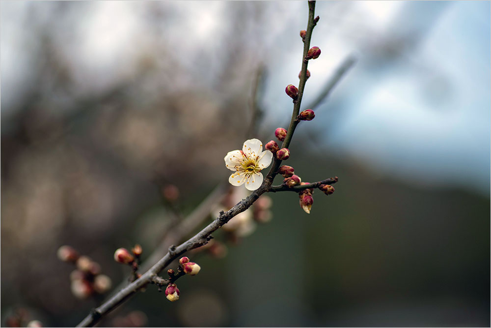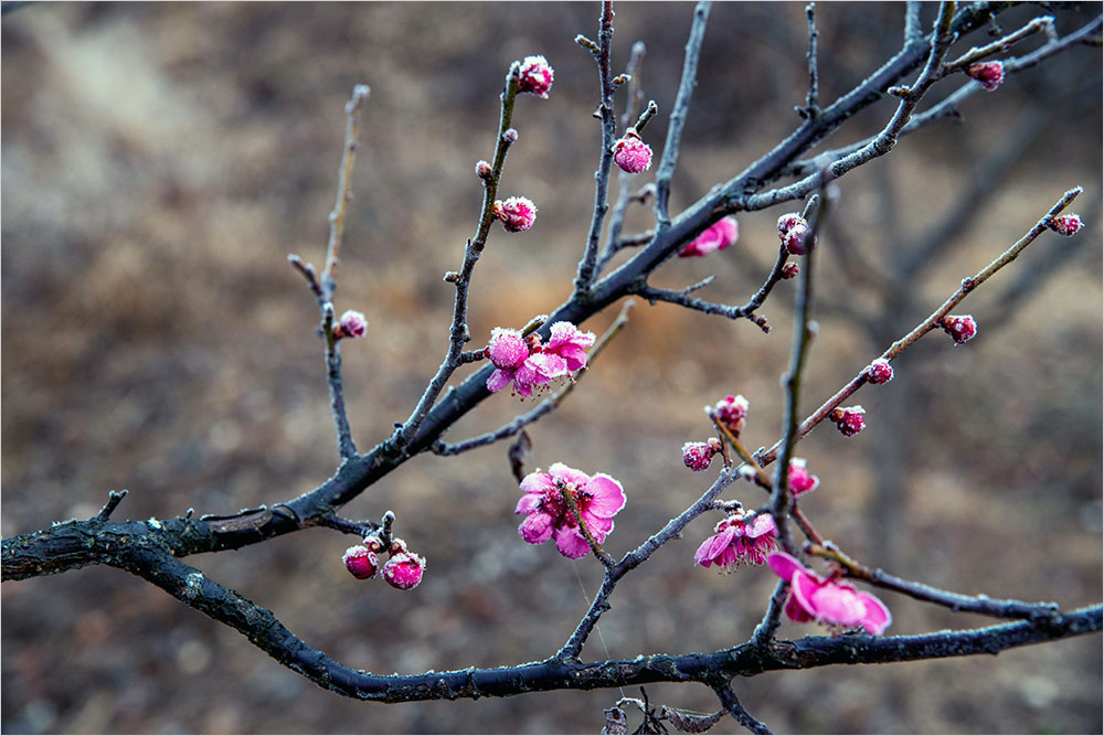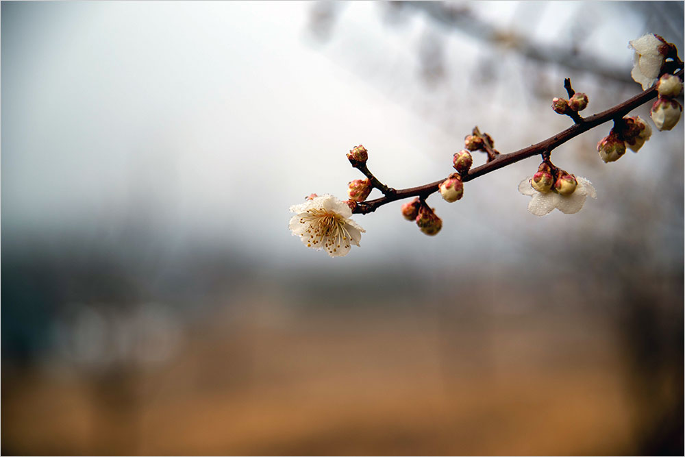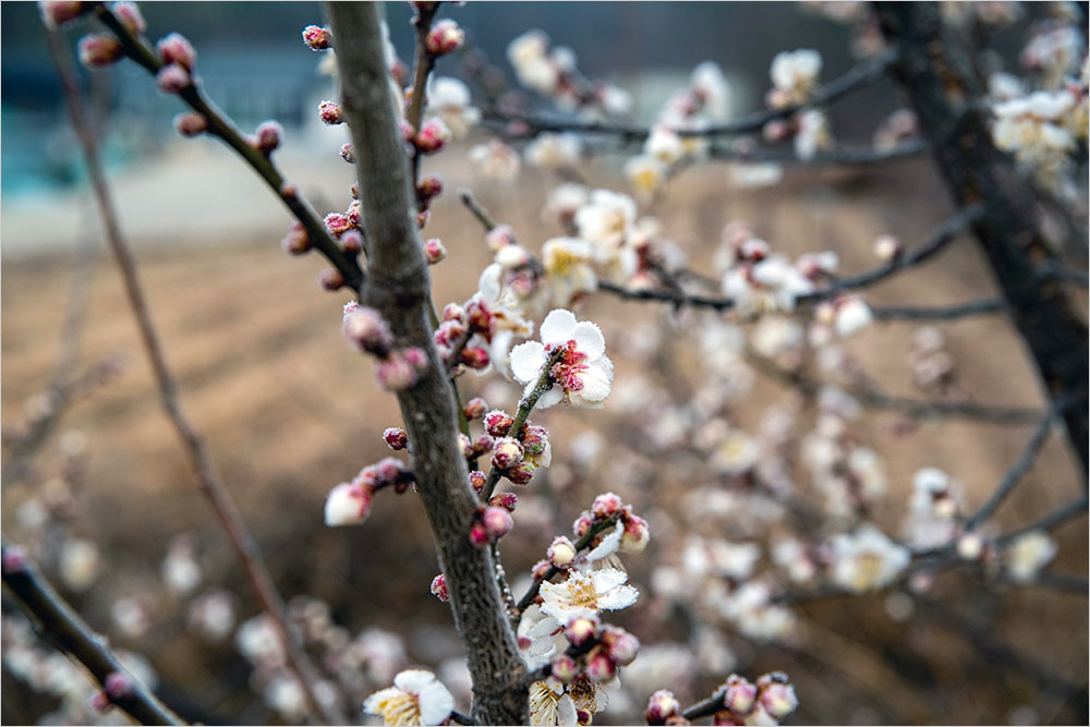 ‘절(節)’과 지조를 드러내는 매화로 ‘설중매(雪中梅)’를 꼽는 것도 같은 이유다. 하긴 눈이 내리는 겨울의 끝에 꽃을 피우는 매화의 모습은 여는 꽃과는 다른 기품이 있기는 하다. 지난 3월 3일에 걸어서 이웃 동네를 돌아오면서 만난 꽃이 이를테면 ‘설중매’였다. 간밤에 비가 잠깐 내렸다 싶었는데, 눈발이 섞여 있었던 모양이다.