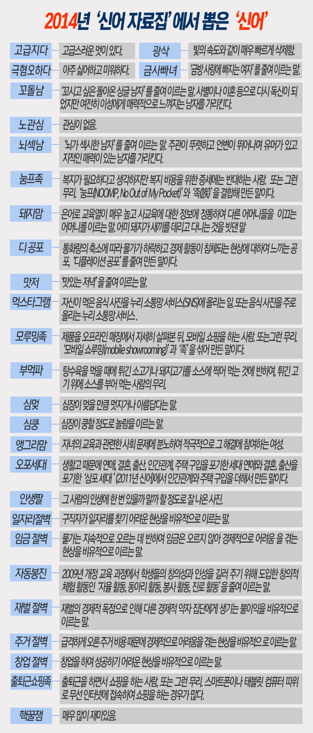 국립국어원(원장 민현식)이 발표한 ‘2014년 신어’를 훑어보면서 요즘 신어는 무엇보다 언중들의 발랄한 표현력을 제대로 드러내고 있구나, 하는 생각을 아니 할 수 없다. 국어원이 2013년 7월부터 2014년 6월까지 일간지 등 온오프라인 대중 매체 139개에 등장한 새 낱말(신어)은 334개다. [국어원 보도자료 바로가기]