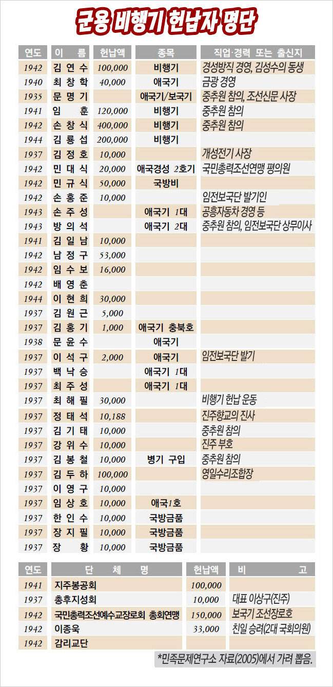 2005년 민족문제연구소가 공개한 군용 비행기를 헌납한 친일 인사 100여 명과 친일단체 명단에 따르면 당시의 친일 인사들이 낸 국방헌금 명세(明細)가 일부 드러난다. 당시 1엔을 오늘날의 화폐 가치로 환산하면 1만 원인데 이들은 1천만 원(천 원)에서 40억(40만 원)까지 일제에 바쳤다.