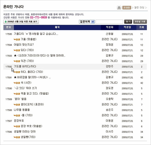 국어원의 열린마당에서는 ‘온라인 가나다’라는 차림표를 이용할 수 있다. 주로 규범이나 어법, 표준국어대사전의 내용 등에 대해서 물어볼 수 있는 곳이다. 나도 몇 차례 이용한 적이 있는데 단박에 답변이 뜨지는 않는다. 빠르면 하루, 늦으면 이틀쯤은 느긋하게 기다려야 한다.