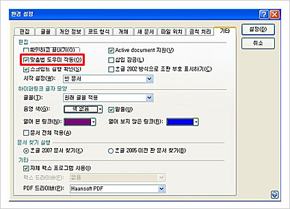 내가 가장 도움을 많이 받는 게 ‘맞춤법 도우미’ 기능이다. 한/글 ‘환경설정’의 ‘기타’ 항목에서 ‘맞춤법 도우미 작동’을 지정해 놓으면 한/글로 문서 작성을 하는 도중 맞춤법에 어긋난 단어를 입력하였을 때 빨간색 밑줄을 그어주는 것이다.