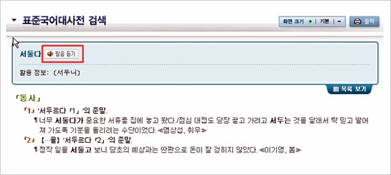 대사전은 썩 마음에 들지는 않는다. 특히 필요한 낱말을 찾으면 간단한 풀이가 먼저 나오고(검색1) 심화된 풀이(검색2)는 한 번 더 들어가야 만날 수 있는 구조는 좀 불편하다. 심화 풀이에서는 ‘발음 듣기’와 ‘용례’까지 제공해 준다. 낱말의 표준발음이 궁금한 이는 유용하게 이용할 수 있겠다. 심화 풀이에서는 ‘의견 보내기’도 할 수 있다.