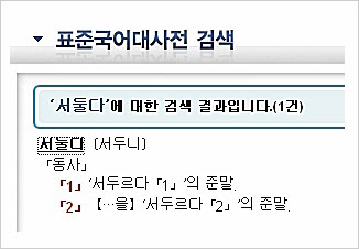 국립국어원 누리집은 초기화면에 있는 ≪표준국어대사전≫(이하 ‘대사전’)을 이용하기 위해서다. 인터넷의 각 포털이나 검색엔진 등에서 국어사전을 이용할 수 있기는 하나 포털마다 제각기 다른 사전을 쓰고 내용도 들쭉날쭉한 듯하다. 그래서 나는 대사전을 쓴다.