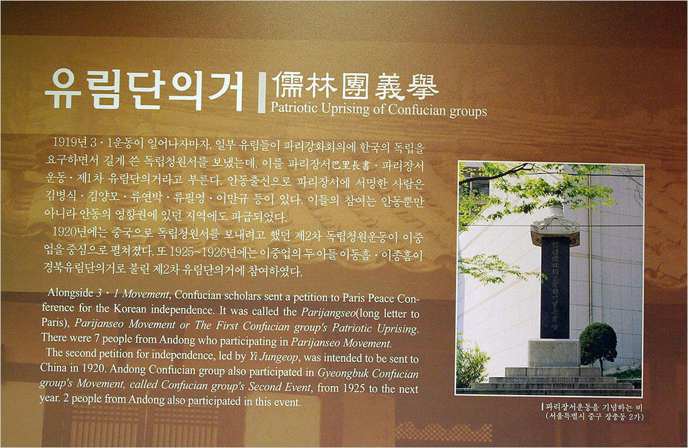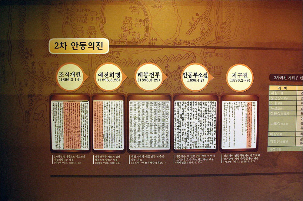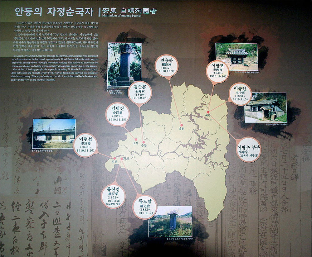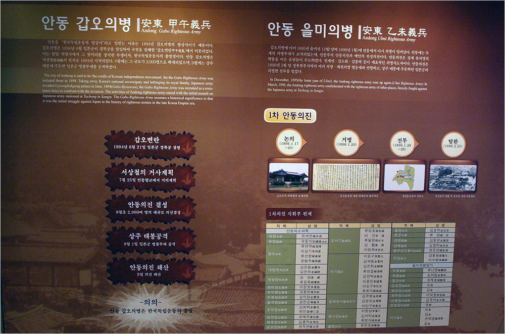 안동은 항일 의병의 효시랄 수 있는 갑오의병(1894)의 발상지요, 1905년 이후 일본 제국주의에 항거하며 스스로 목숨을 끊은 이 10명을 낳은 고장이다. (전국 66 명) 안동은 갑오 이후 1945년 안동농림학교 학생 항일운동에 이르기까지 51년 동안 쉼 없는 독립투쟁을 전개하여 단일 시군으로는 전국에서 가장 많은 독립 유공 포상자(310여 명, 포상받지 못한 이를 포함하면 1천여 명)를 배출했다.