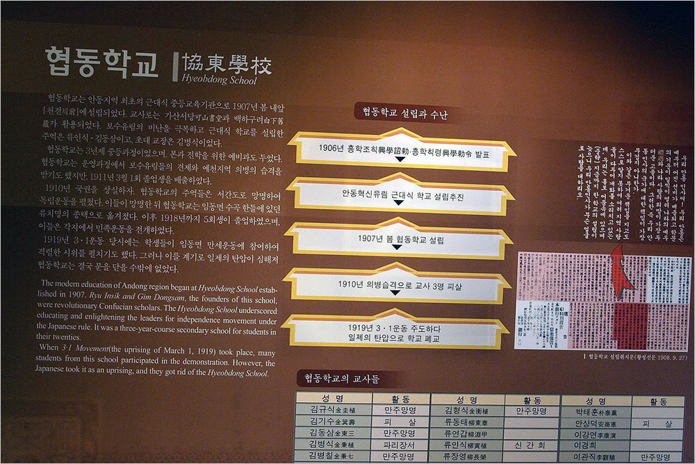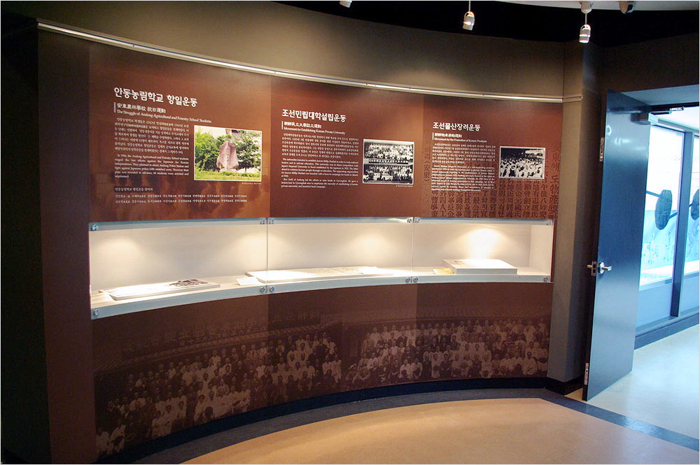 유물 중심의 박물관이 아니라 주로 안동 지역을 중심으로 한 독립운동의 전개, 안동 출신 독립운동가들의 활동 소개가 중심이다. 공을 들인 흔적은 역력하고 곳곳에 동영상이 펼쳐지는 등의 시청각적 전시에도 불구하고 어쩐지 아쉬워지는 대목이다.