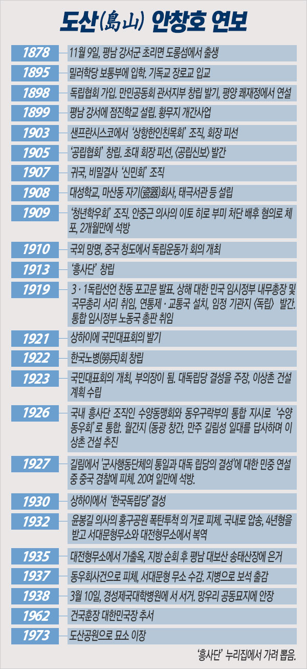 1938년 3월 10일, 도산(島山) 안창호(1878~1938)가 경성제국대학 부속병원에서 간 경화증으로 파란 많았던 우국의 삶을 마감했다. 그는 1937년 6월 수양동우회 사건으로 일본 경찰에 붙잡혀 복역하다가 같은 해 12월에 병으로 보석 되어 요양 치료를 받던 중이었다. 향년 60세.