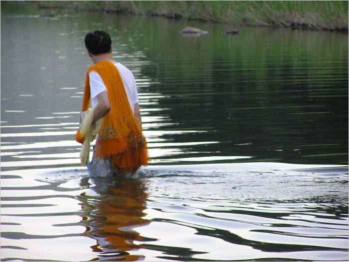 도덕을 가르치는 친구 박(朴)은 어부다. 나는 아직 그처럼 완벽한 투망의 기술을 가진 사람을 만나지 못했다. 계곡을 나와 동강 줄기에서 두어 시간 동안 천렵을 했는데, 그의 완벽한 투망의 순간을 사진기로 잡겠다고 나는 그를 내내 뒤쫓았다. 그러나 느려터진 내 똑딱이 사진기의 셔터속도는 그의 동작을 잡아낼 수 없었다.