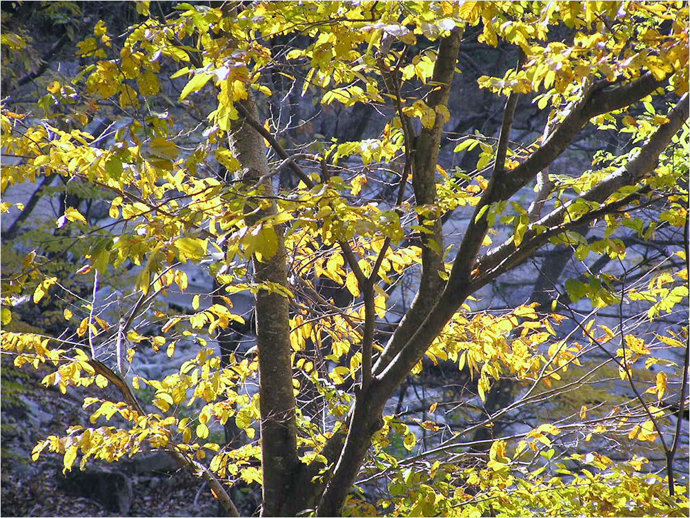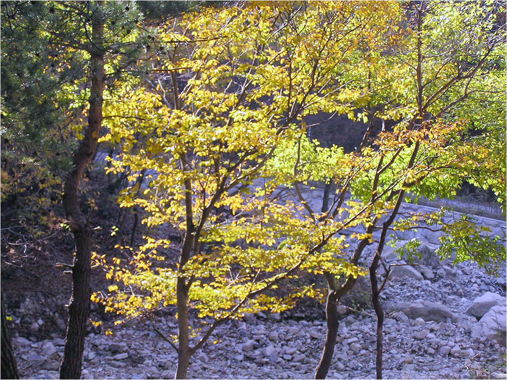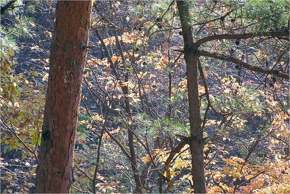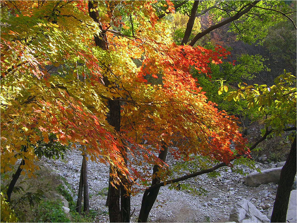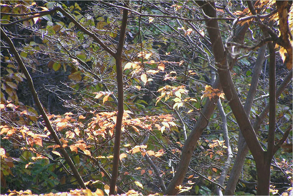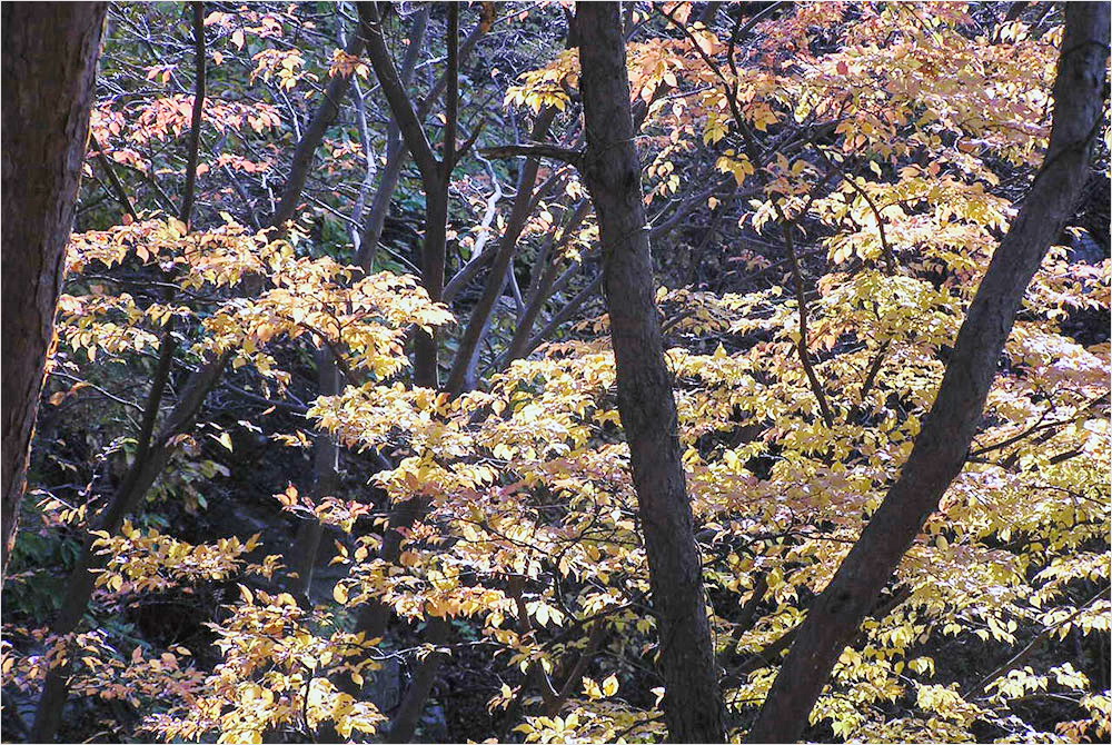 빛의 위치나 세기에 따라서 풍경은 몇 번씩 몸을 바꾸는가. 내려오는 길가의 숲은 역광의 햇빛을 받아 더 선명하고 더 아름다운 붉고 푸른 단풍으로 불타고 있었다. 여전히 화질에는 자신이 없었지만 밑져야 본전, 나는 틈나는 대로 셔터를 눌러댔다. 집에 와서 컴퓨터에 옮겨놓고 보니, 그나마 단풍잎의 빛깔은 새롭게 다가온다. 아래의 사진들이 그 전리(戰利)이다.
