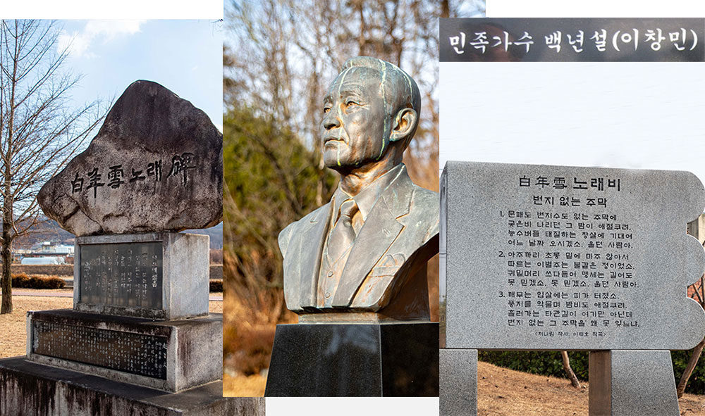 그는 성주에서 가장 유명한 인물이다. 심산이나 자하는 몰라도 ‘나그네 설움’의 백년설을 모르는 성주사람은 아마 없으리라. 워낙 유명한 유행가를 불러서지만, 성주 읍내에 세 군데나 세워진 백년설 노래비가 곳곳에서 그의 존재를 환기해 주기 때문이다.