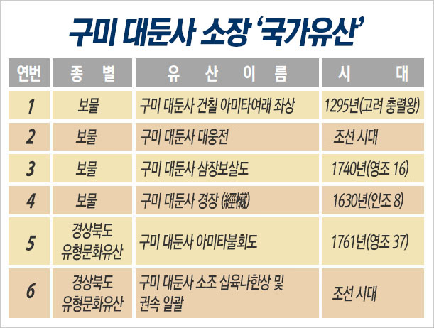 대둔사를 다녀오고 난 뒤에 지정된 보물이 하나 더 있다. 2021년 1월에 지정된 ‘구미 대둔사 경장(經欌)’이다. 경장은 ‘경전을 보관하는 함’이다. ‘구미 대둔사 경장’은 뒷면의 명문을 통해 1630년(인조 8)에 제작한 사실을 알려주는 불교 목공예품으로, 제작 시기뿐만 아니라 제작에 참여한 ‘화원(畵員)’, 인출장인(‘引出匠人)’, ‘태장인(炲匠人)’ 등의 정보를 모두 알려 주고 있어 특별한 주목을 받았다.
