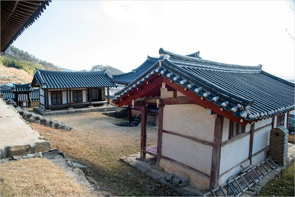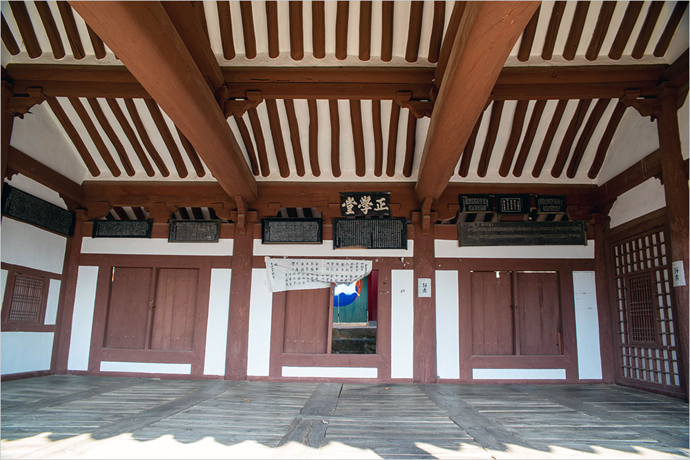 산비탈에 자리 잡은 서원은, 산 중턱에 바투 붙은 문루인 읍청루(挹淸樓)의 붉은 단청이 강렬해서일까, 좀 위압적으로 아랫마을을 내려다보고 있었다. 가파른 계단을 올라 경내에 들어서면 서원 강당인 정학당(正學堂)이 다시 위압적으로 방문객을 맞는다. 계단 위 축대의 이 서원 강당이 위압적으로 느껴지는 까닭은 건물의 크기나 위치 등의 구조적 이유 탓이다.