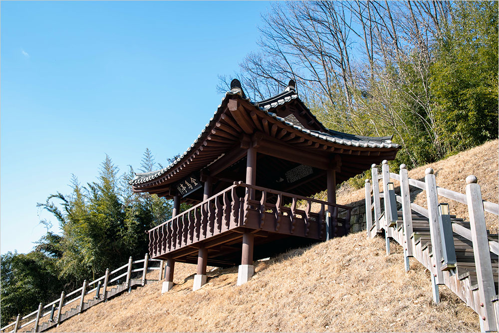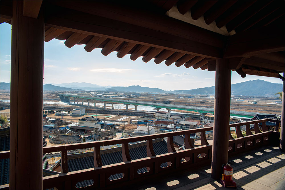 남산실 뒤로 돌아서 산비탈의 데크 길을 오르면 정자 금오정에 닿는다. 원리 마을을 내려다보는 이 정자는 2018년에 남산실, 청아재와 함께 건립된 정자다. 정면 3칸, 측면 1칸의 정자지만, 규모가 작지 않다. 원리 마을은 물론, 새로 뚫린 33번 국도가 훤히 내려다보였다.