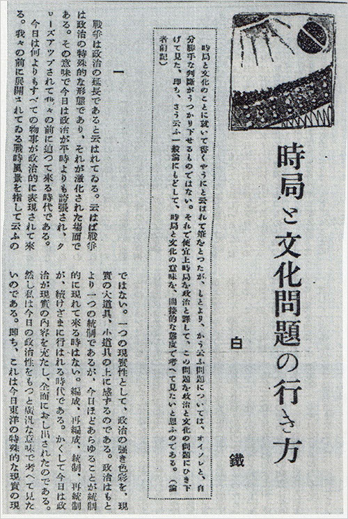 「금후엔 문화적 사명이 중대」에서 그는 “지나(支那) 국민이 우리 제국의 진의를 이해해서 제국의 협력에 응하는 문제 같은 것이 건설기의 중심 문제인데, 이 중심 문제의 실천을 위한 수단이란 역시 정치가 아니고 문화의 힘”이라고 주장하였다.