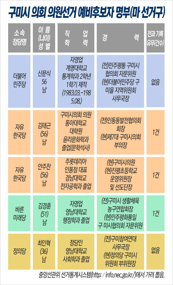 구미시 마 선거구에는 5월 20일 현재 5명의 예비후보가 등록되어 있다. 더불어민주당에서 1명, 자유한국당에서 2명, 그리고 바른미래당에서도 1명이 나왔다. 자유한국당 2명은 현직 시의원이다. 상황이 녹록지 않은 것이다.