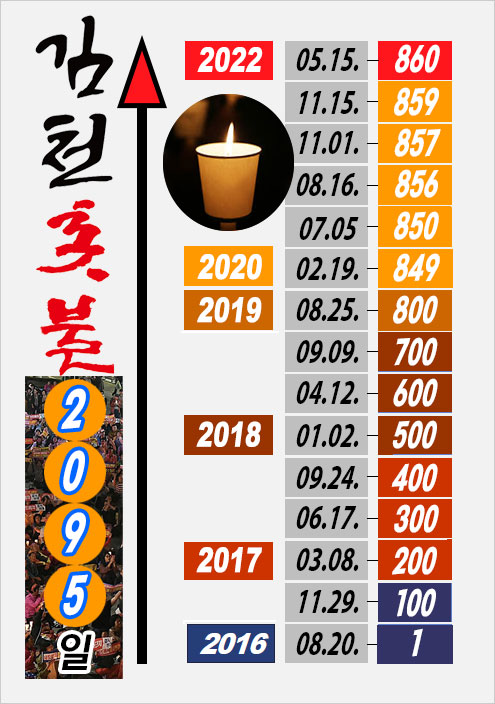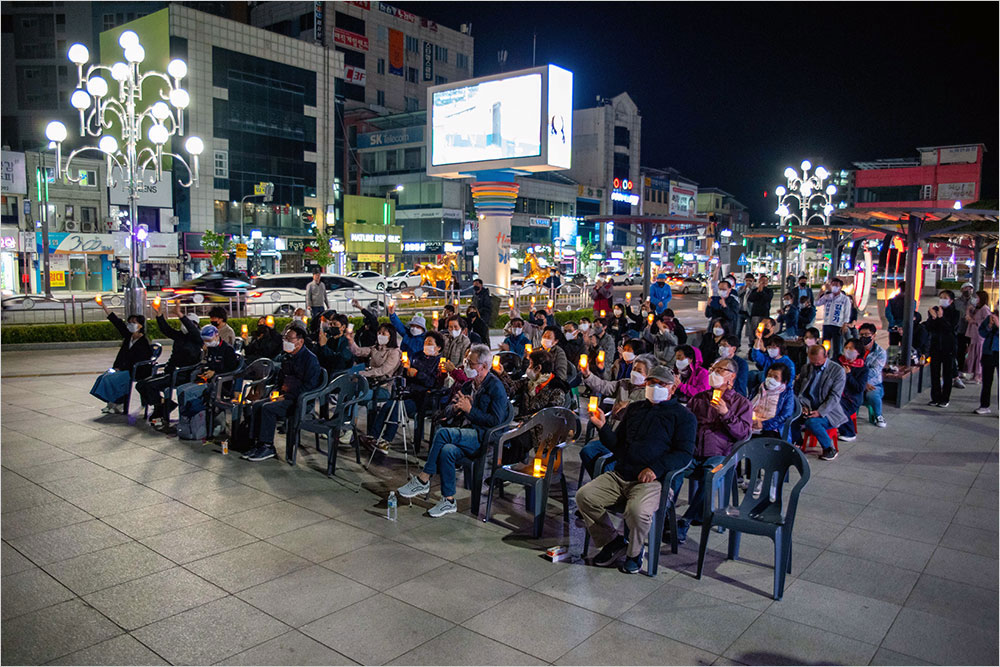 김천 촛불은 2021년 한 차례도 열리지 못했다. 팬데믹 상황은 사람들의 일상을 깨뜨린 데 그치지 않고, 생존을 위해 싸우는 이들의 시간표마저 지워버렸다. 그러나 김천시민들은 2020년 11월 15일 이후, 545일 만에 오늘 860회 촛불을 다시 켜기로 한 것이다.