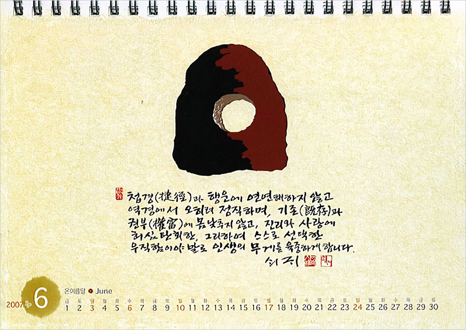 유월의 달력에서 쇠귀 선생은 ‘진리와 사랑’으로 살아가는 ‘우직한 삶’을 이야기한다. 그는 권력과 부 앞에 당당하고 진리와 사랑 앞에 마음을 비우며, 지름길과 행운보다 정직함을 버리지 않는 역경을 스스로 선택하는 ‘우직함’이 삶을 삶답게 이룬다고 힘주어 말한다.