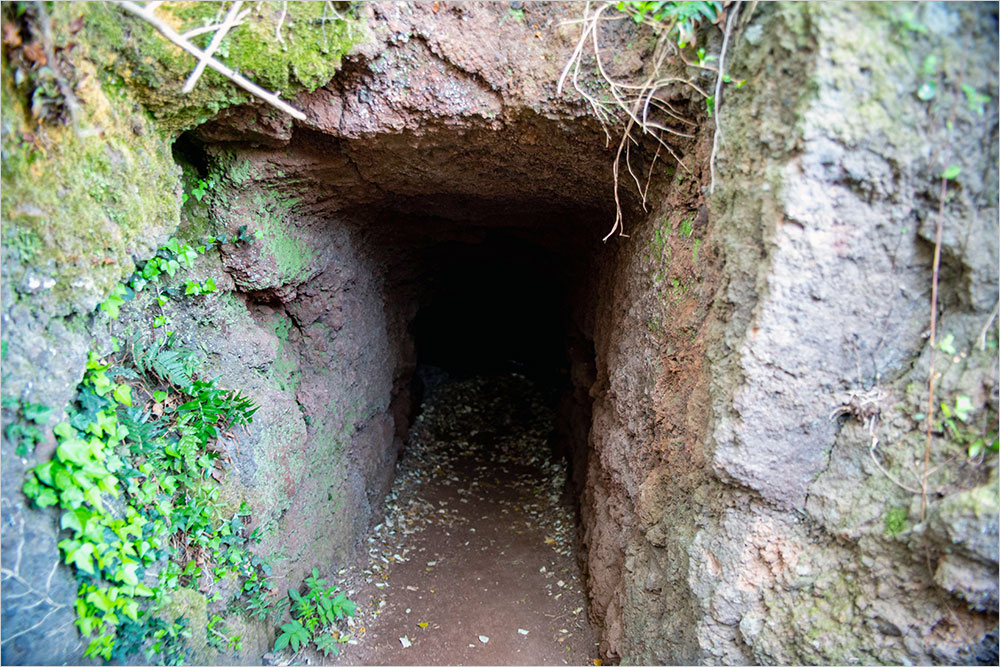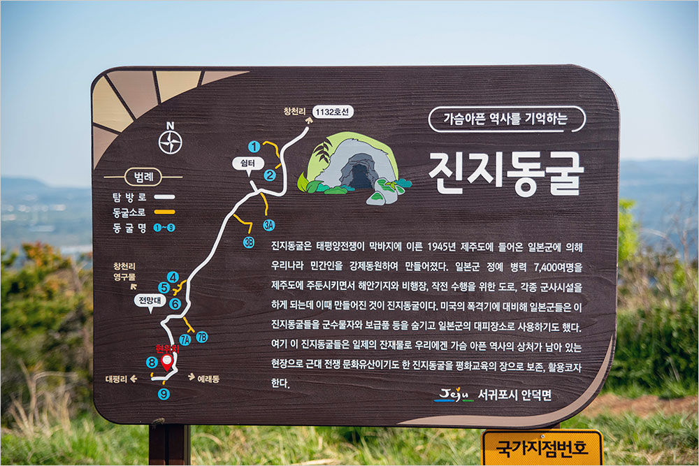 정작 오름보다는 정상 부근 산등성이에 아홉 군데나 이어져 있는 ‘진지 동굴’이 인상적이었다. 1945년 태평양전쟁 막바지에 제주도에 들어온 일본군이 우리 민간인을 강제 동원하여 만든 이 동굴은 군수물자와 보급품 등을 숨기고 일본군의 대피 장소로 사용하기도 했다고 한다.