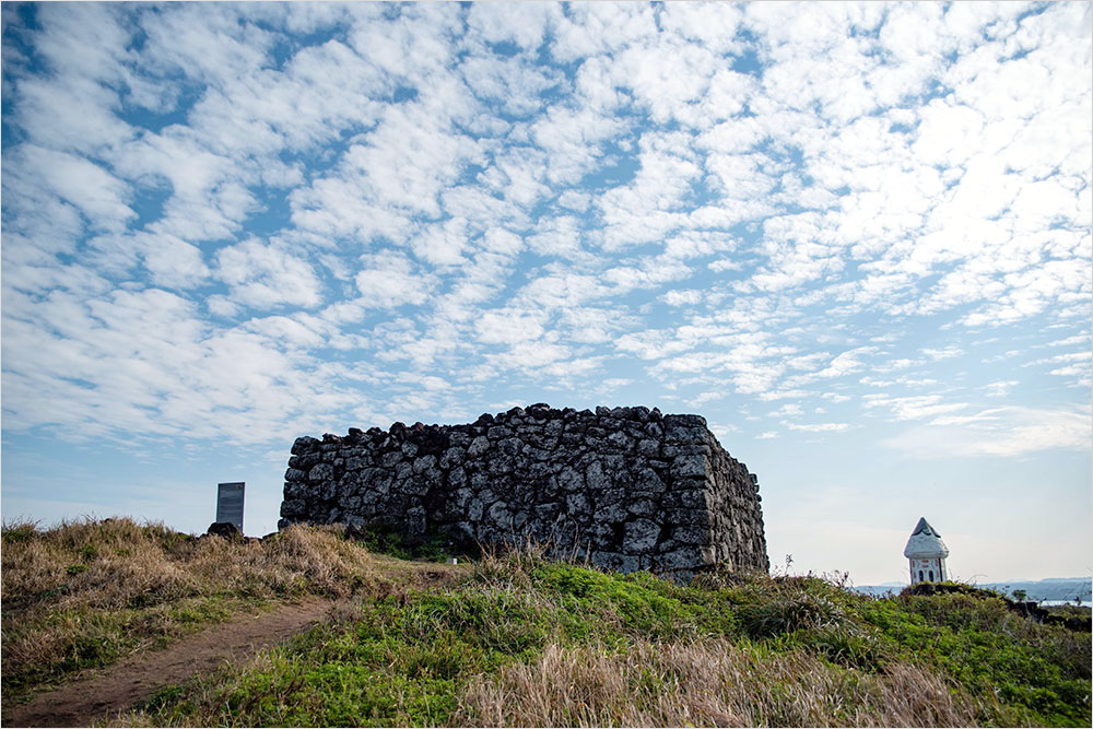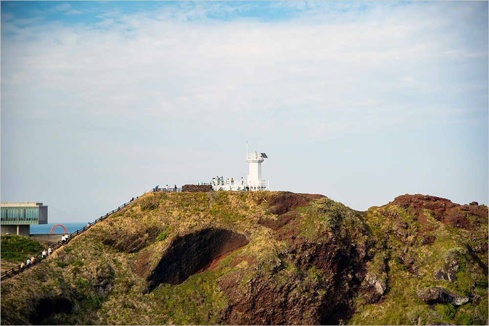 연대에서 오른쪽으로 눈을 돌리면 들어오는 봉우리는 제주말로 ‘송이’라고 하는 붉은색 화산재로 이루어진, 일명 ‘붉은오름’이다. 그 정상에는 하얀 등대가 서 있는데, 등대는 오름의 붉은 흙빛, 그리고 하늘과 바다의 파랑과 대비되어 또 다른 이국적인 정취를 자아낸다. 마땅히 있어야 할 유채꽃은 때가 지나서인가, 보이지 않았다.