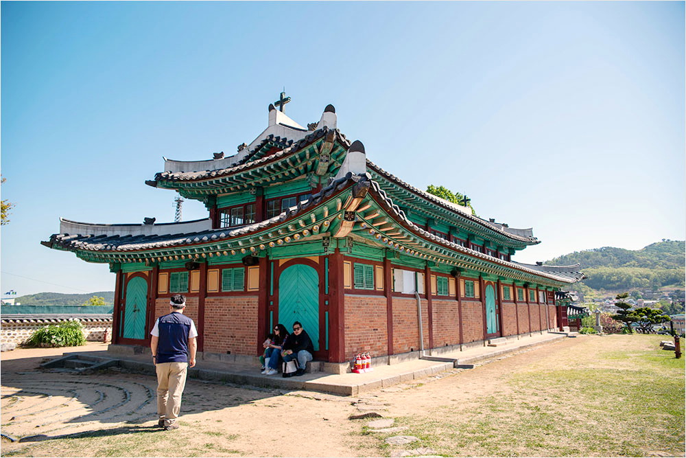 성당의 입구로 오르는 계단, 외삼문·내삼문·성당·사제관을 동남향 가로축으로 배치한 외부공간의 구성이 불교사찰의 구릉지가람과 닮았다. 성당이라고 씌어 있지만, 마치 절집을 찾는 기분이 드는 것은 그래서인 듯하다. 외삼문, 솟을대문은 팔작지붕으로 담장과 연결되어 있다. 평대문 팔작지붕의 내삼문 서쪽 칸은 종각으로 쓰이고 있다.