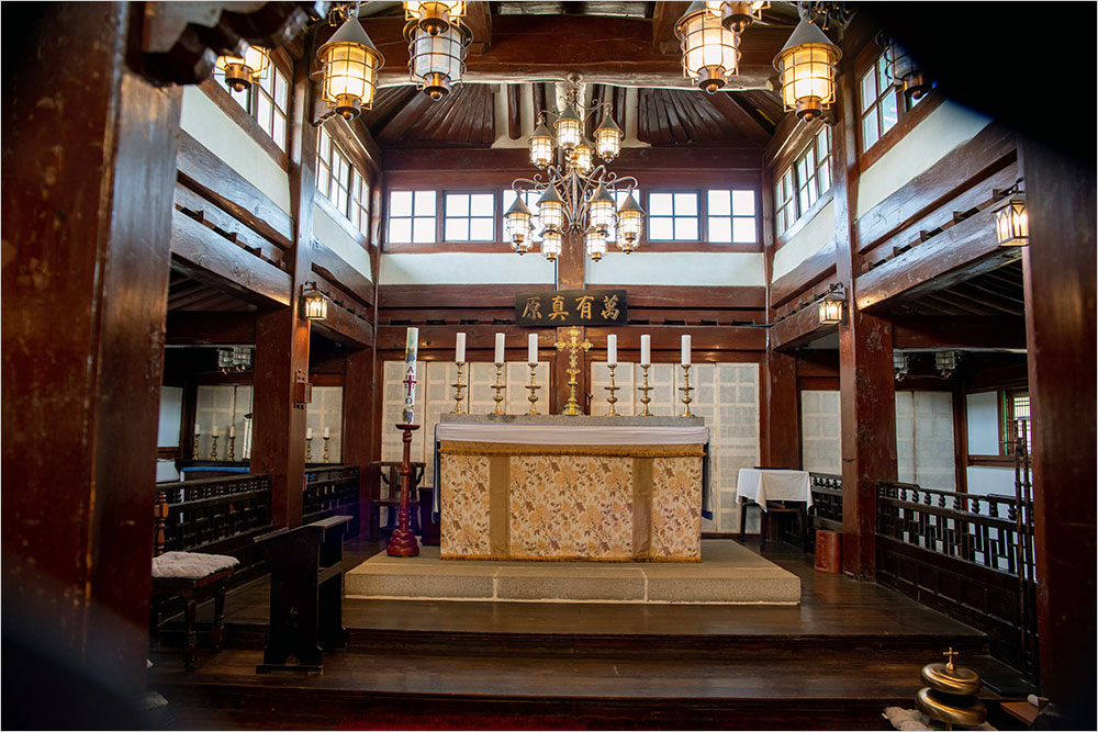 강화성당은 외관과 외부 구조는 비록 한국의 전통 불교사찰의 그것을 따랐지만, 내부에는 교회 기능에 충실한 공간을 연출했다. 절집에 온 듯한 기분으로 외삼문과 내삼문을 지나 성당 안에 들어서면, 웅장한 모습으로 다가오는 제단의 십자가와 예수상 등으로 개신 교회를 분명하게 환기하게 되는 이유다.