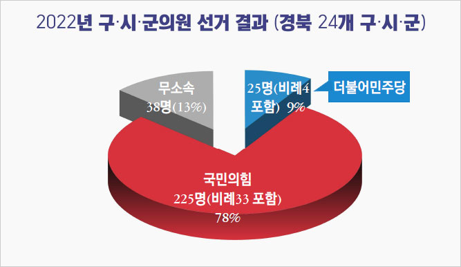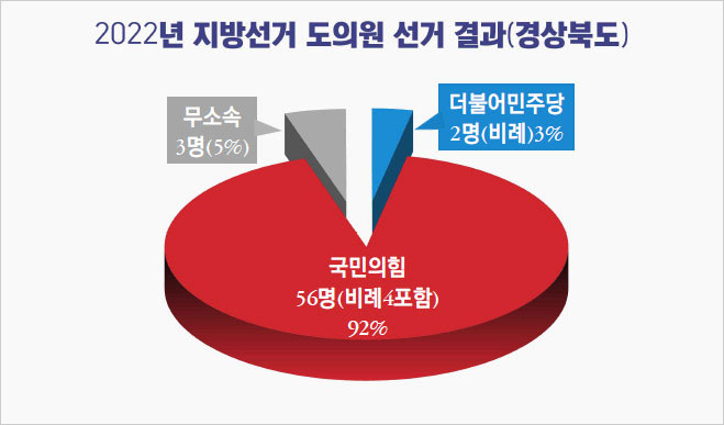 경상북도의회는 더 심각하다. 도의원 정수 61명은 국민의힘이 56명(지역구 52 + 비례4), 무소속 3명, 더불어민주당 2명(비례)으로 구성된다. 국민의힘이 92%의 의석을 점유함으로써 무소불위의 권한을 행사할 수 있게 됐다. 경상북도 내 24개 구시군 가운데서 더불어민주당은 지역구 도의원을 1명도 진출시키지 못한 것이다. (아래 그래프 참고)
